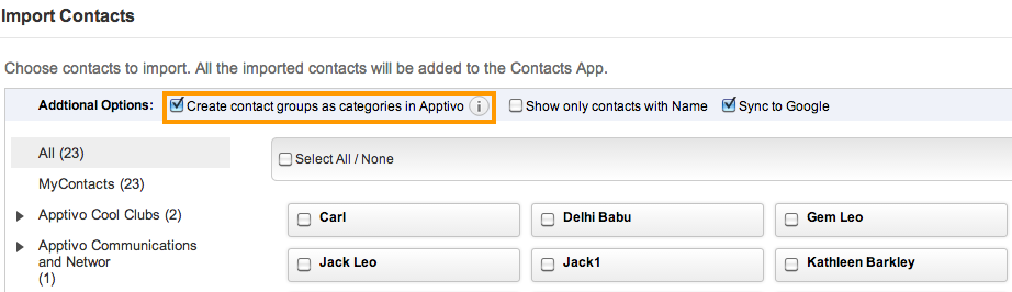 - You can view “Create Contact Groups as categories in Apptivo” option. Enable the option to sync groups as contact categories.