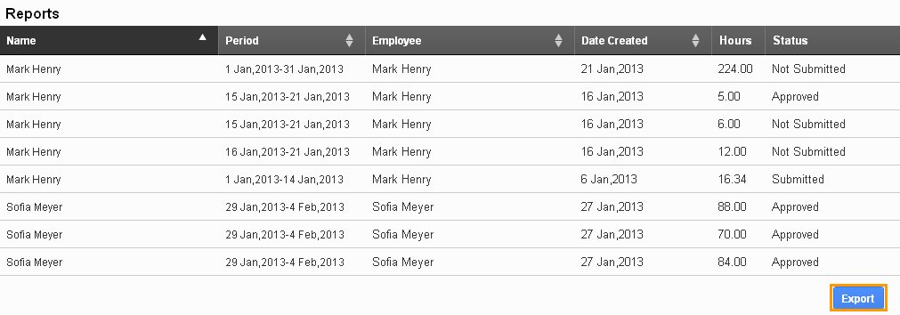 Customize your searches of timesheet, and then save these searches as reports, any list of saved reports can be quickly viewed, instead of re-entering your search query. A report comprises of “My Reports” and “Reports shared by others”. These reports are exported in excel format for future use.