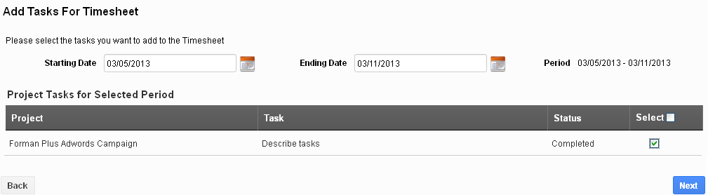 When the project converts into the timesheet, all the billable tasks involved during are listed. Each task can be specified with their work log duration. Timesheet tracks the work log as hours spent for the task completed in a given day.