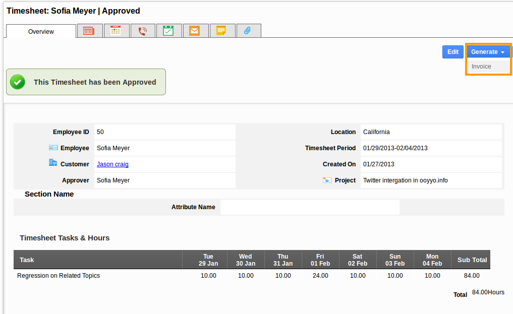 The approved timesheet gets converted to an invoice. At once the timesheet is created with the customer name to which it has been invoiced it gets approved by the designated manager (project manager, customer manager or employee manager). While generating invoice for a timesheet the attributes like a customer, employee name and total hours accumulated for the tasks would be pre-populated. (The add services and add items are optional as per your requirement).